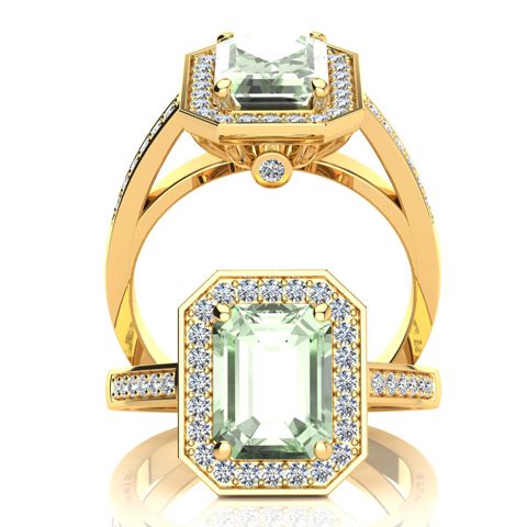 This stunning gemstone and halo diamond ring features one 8x6mm emerald shape green amethyst gemstone at 1.50 carats. It is surrounded by 38 sparkling diamonds in a halo and down the band in I-J color, SI2-I1 clarity at 0.39 carats. Total gem weight is 1.89 carats. This ring is crafted in 14 karat yellow gold.