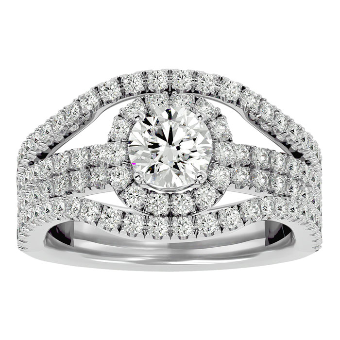 This fabulous engagement ring features a sparkling 3/4 carat clarity enhanced center diamond in I-J color, I1-I2 clarity. It is surrounded by a halo of 104 side diamonds totaling 1 1/4 carat. Total carat weight is 2 carats. This ring is in 14 karat white gold.
