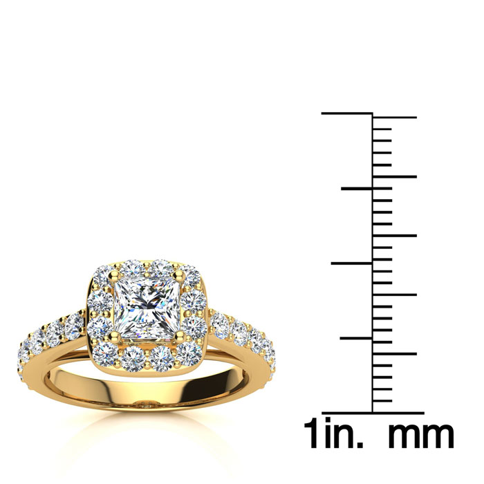 For a classically beautiful diamond engagement ring, try this engagement ring crafted in 14 karat yellow gold. This ring boasts a 1 carat center diamond surrounded by a halo of diamonds. The ring has a total diamond weight of 2.06 carats. There are 27 diamonds total in H-I color and SI2-I1 clarity.