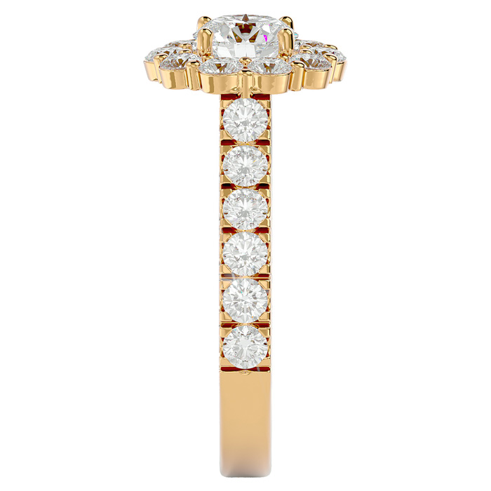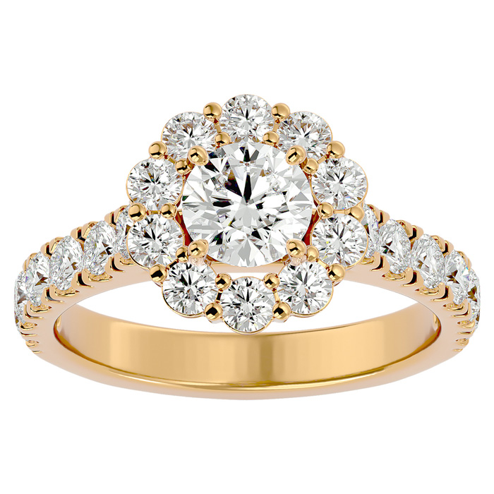 This fabulous diamond engagement ring features a sparkling 3/4 carat round shape clarity enhanced center diamond in I-J color, I1-I2 clarity. It is surrounded by 22 side diamonds totaling 1 1/4 carats. Total carat weight is 2 carats. This ring is in 14 karat yellow gold.