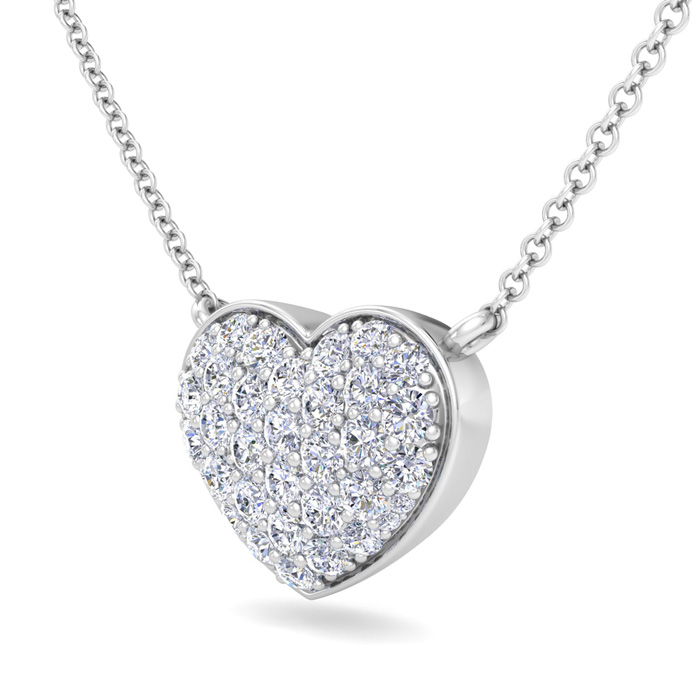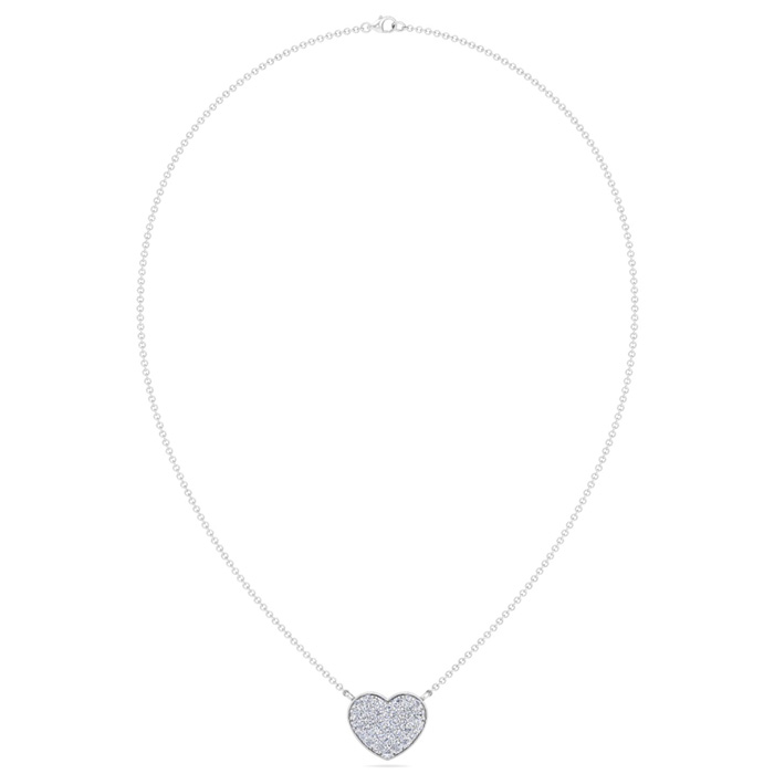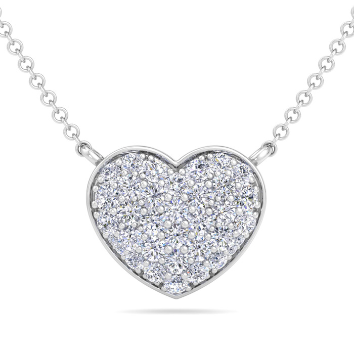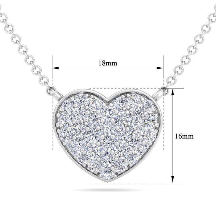 This diamond heart necklace features 35 sparkling round shape lab grown diamonds totaling 2 carats. Diamond color is G-H, diamond clarity VS. This necklace is in 14 karat white gold and comes with an adjustable cable chain with a lobster-claw clasp. The chain has rings at 16, 17 and 18 inches. This pendant is 3/4 inch in diameter.