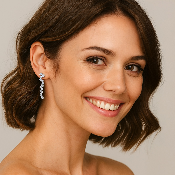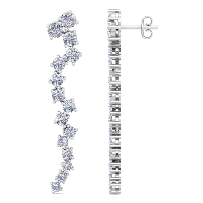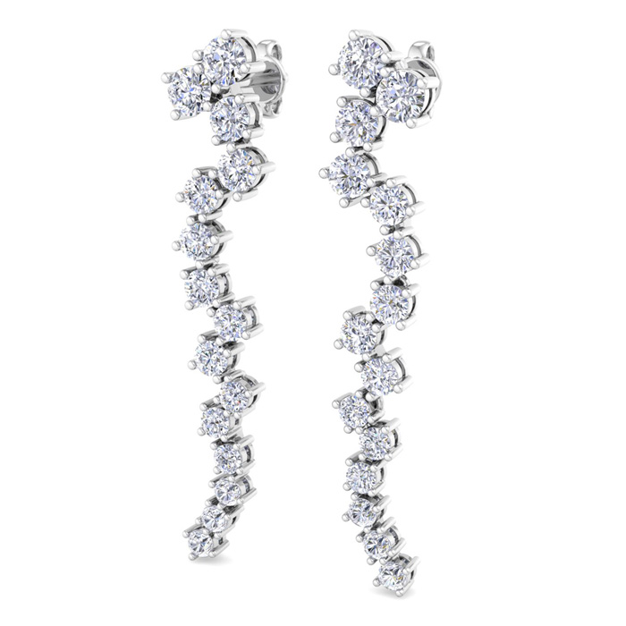 These lab grown diamond earrings feature 30 sparkling round shape lab grown diamonds totaling 2 carats. Diamond color is G-H, diamond clarity VS. These earrings are in 14 karat white gold and have comfortable and secure post with friction backs. The earrings drop down 2 inches!