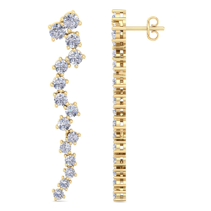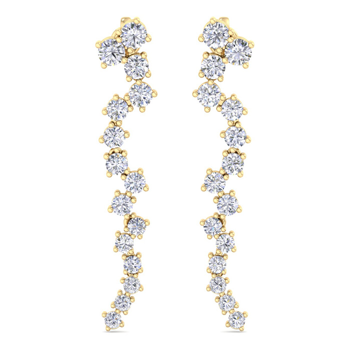 These lab grown diamond earrings feature 30 sparkling round shape lab grown diamonds totaling 2 carats. Diamond color is G-H, diamond clarity VS. These earrings are in 14 karat yellow gold and have comfortable and secure post with friction backs. The earrings drop down 2 inches!