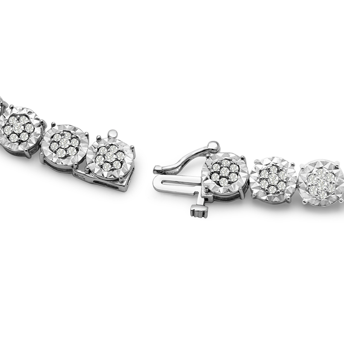 This diamond bracelet features 217 sparkling diamonds in H-I color, I1-I2 clarity weighing 2 carats. This bracelet is in sterling silver and has a box with tongue and safety clasp. It is 7 inches long.