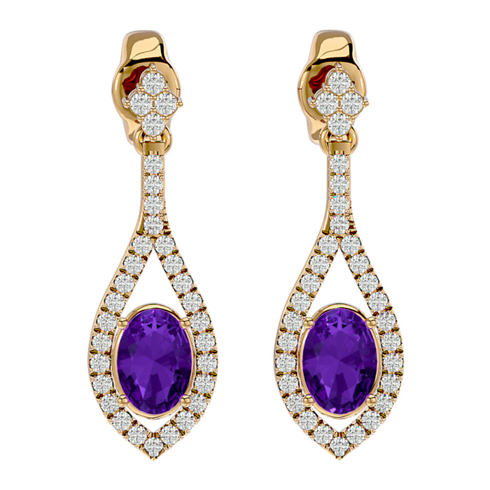 These elegant gemstone earrings feature two 7x5mm oval shape amethyst gemstones at approximately 1.40 carats. They are surrounded by 62 sparkling diamonds in I-J color, I1-I2 clarity at 1/2 carat total weight. Total gem weight is approximately 1.90 carats. These earrings are in 14 karat yellow gold and have comfortable and secure friction backs. Each earring dangles down 1 inch.