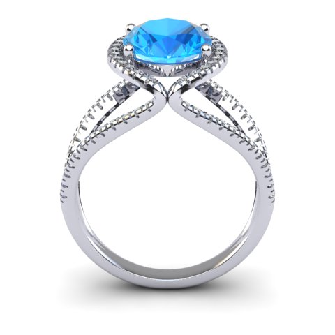 This stunning gemstone and halo diamond ring features one 8x6mm oval shape blue topaz gemstone at 1.50 carats. It is surrounded by 86 sparkling diamonds in a halo and down the split shank band in H-I color, I1-I2 clarity at 0.43 carats. Total gem weight is 1.93 carats. This ring is crafted in 14 karat white gold.