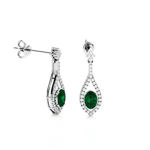 2 Carat Oval Shape Emerald and Diamond Dangle Earrings In 14 Karat White Gold