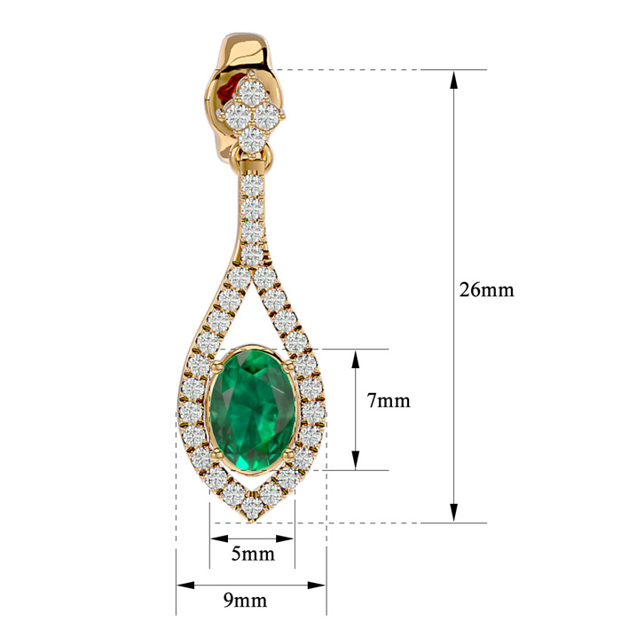 These elegant gemstone earrings feature two 7x5mm oval shape emerald gemstones at approximately 1.60 carats. They are surrounded by 62 sparkling diamonds in I-J color, I1-I2 clarity at 1/2 carat total weight. Total gem weight is approximately 2.10 carats. These earrings are in 14 karat yellow gold and have comfortable and secure friction backs. Each earring dangles down 1 inch.