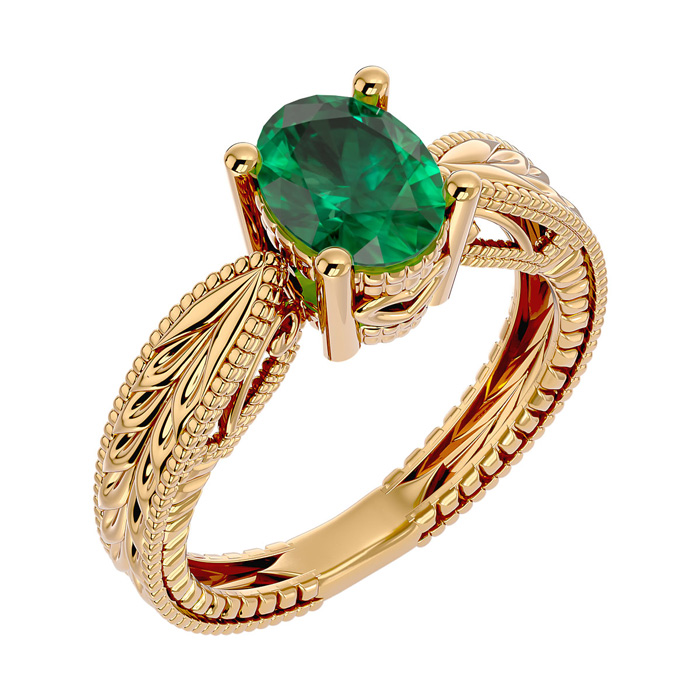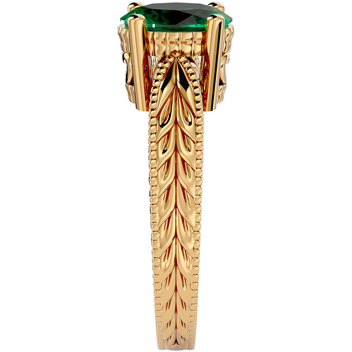 2 Carat Oval Shape Emerald Ring With Tapered Etched Band In 14 Karat Yellow Gold