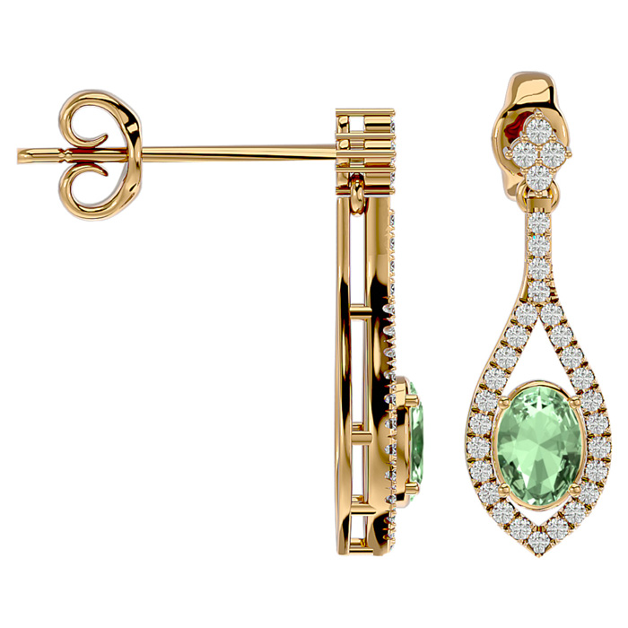 These elegant gemstone earrings feature two 7x5mm oval shape green amethyst gemstones at approximately 1.40 carats. They are surrounded by 62 sparkling diamonds in I-J color, I1-I2 clarity at 1/2 carat total weight. Total gem weight is approximately 1.90 carats. These earrings are in 14 karat yellow gold and have comfortable and secure friction backs. Each earring dangles down 1 inch.