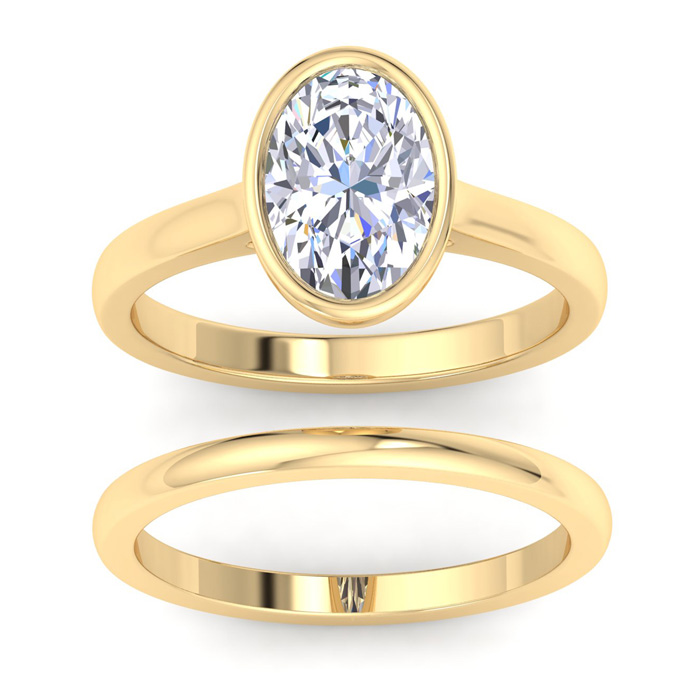 2 Carat Oval Shape Lab Grown Diamond Ring With Matching Band In 14K Yellow Gold, Solitaire Bezel Setting