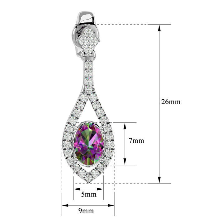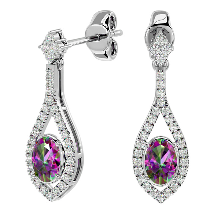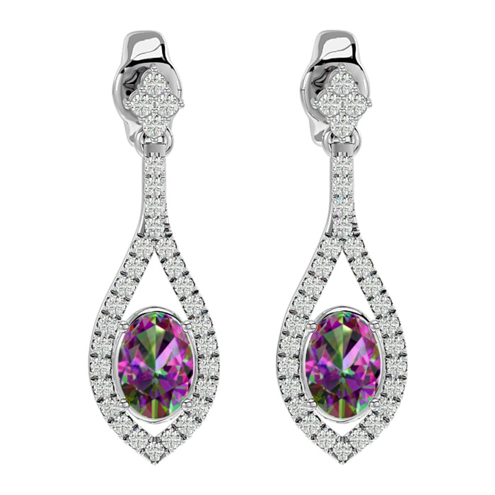 These elegant gemstone earrings feature two 7x5mm oval shape mystic topaz gemstones at approximately 1.40 carats. They are surrounded by 62 sparkling diamonds in I-J color, I1-I2 clarity at 1/2 carat total weight. Total gem weight is approximately 1.90 carats. These earrings are in 14 karat white gold and have comfortable and secure friction backs. Each earring dangles down 1 inch.