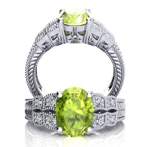 2 Carat Oval Shape Peridot and Diamond Ring In 10 Karat White Gold