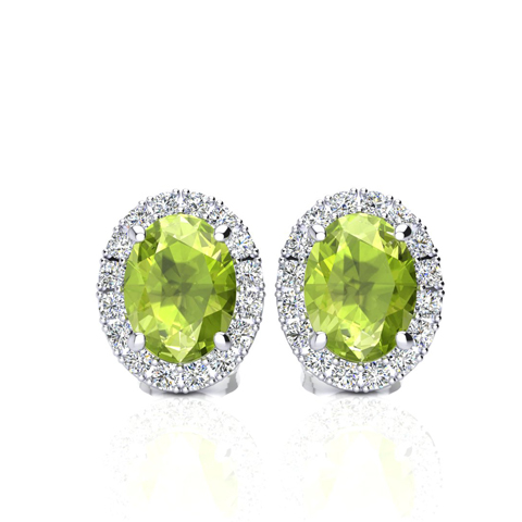 These stunning gemstone and halo diamond earrings features two 7x5mm oval shape peridot gemstones at 1.80 carats. They are surrounded by 40 sparkling diamonds in I-J color, I1-I2 clarity at 0.20 carats. Total gem weight is 2.00 carats. These earrings are crafted in 14 karat white gold and have comfortable and secure post with friction backs.