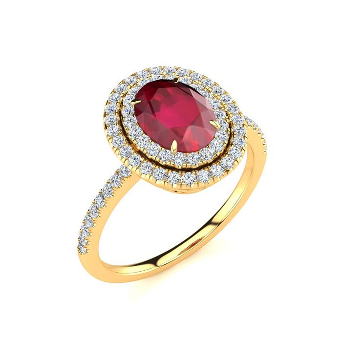2 Carat Oval Shape Ruby and Double Halo Diamond Ring In 14 Karat Yellow Gold