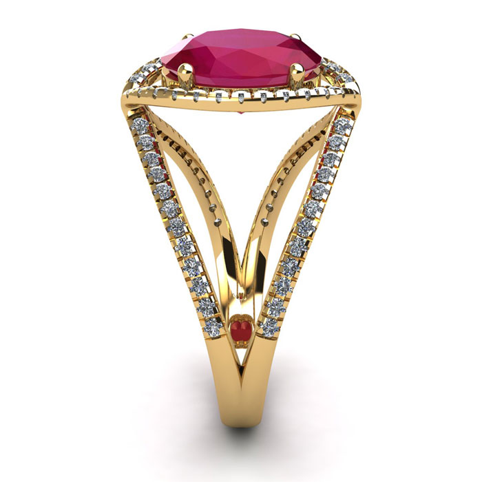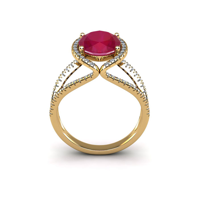 Retrograde Birthstones™ 2 Carat Oval Shape Ruby and Halo Diamond Ring In 14 Karat Yellow Gold