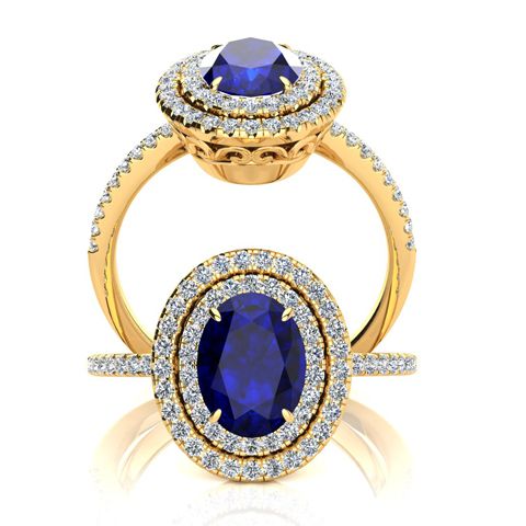 2 Carat Oval Shape Sapphire and Double Halo Diamond Ring In 14 Karat Yellow Gold