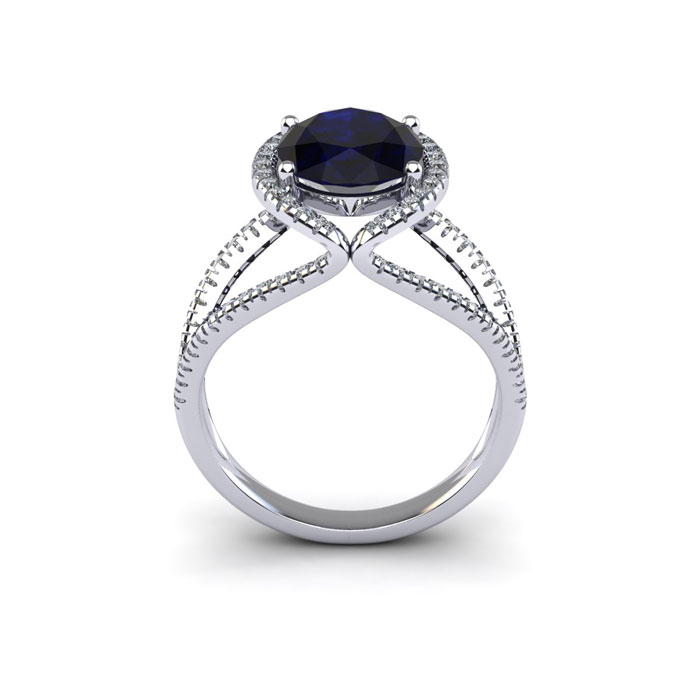 This stunning gemstone and halo diamond ring features one 8x6mm oval shape sapphire gemstone at 1.60 carats. It is surrounded by 86 sparkling diamonds in a halo and down the split shank band in H-I color, I1-I2 clarity at 0.43 carats. Total gem weight is 2.03 carats. This ring is crafted in 14 karat white gold.