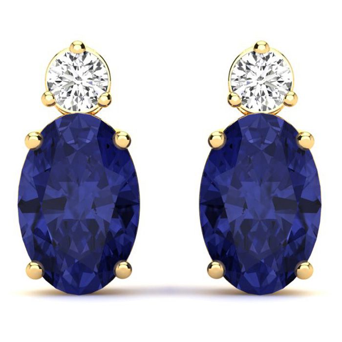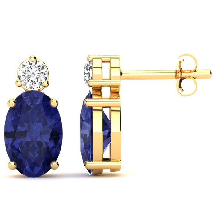 These stunning gemstone and diamond earrings feature two 7x5mm oval shape tanzanite gemstones at 1.90 carats. The gemstones are accented with two sparkling diamonds in a in I-J color, SI2-I1 clarity at 0.06 carats. Total gem weight is 1.96 carats. These earrings are crafted in 14 karat yellow gold and come with comfortable and secure post with friction backs.
