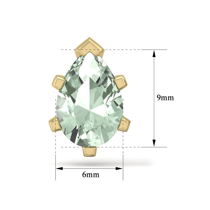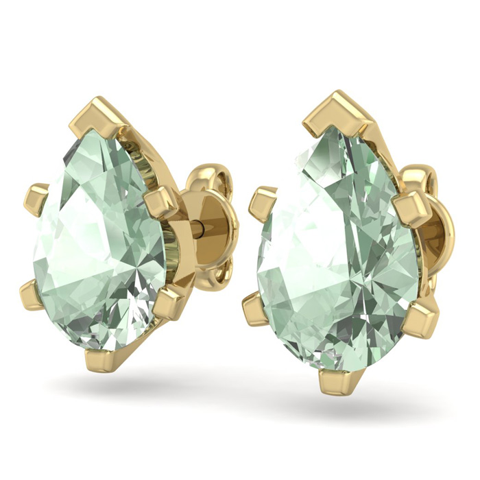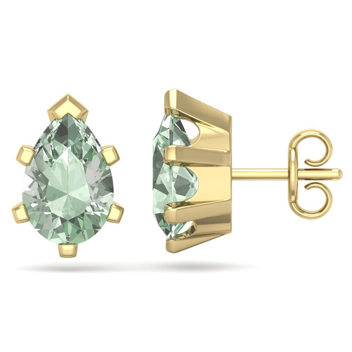 These classic earrings feature two 9x6mm pear shape green amethyst gemstones. Each stone weighs approximately 1.05 carats, for a total carat weight of approximately 2.10 carats. These earrings are in 14 karat yellow gold over sterling silver and have comfortable and secure post with friction backs.