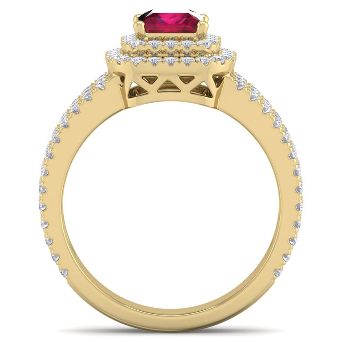2 Carat Princess Shape Double Halo Ruby and Diamond Engagement Ring In 14 Karat Yellow Gold