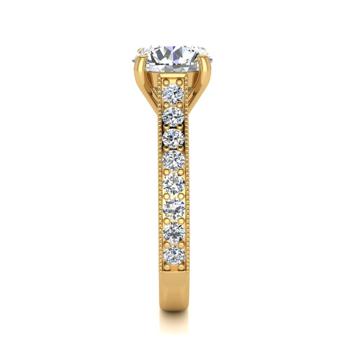 Beautiful traditional and timeless diamond engagement ring that will make any bride happy. With 2.00 carats of fiery diamonds, this engagement ring includes a 1.50 carat clarity enhanced round brilliant center diamond and 16 shimmering diamonds set in milgrain channels on the band. White I-J color diamonds of I1-I2 clarity and mounted in 14k yellow gold.