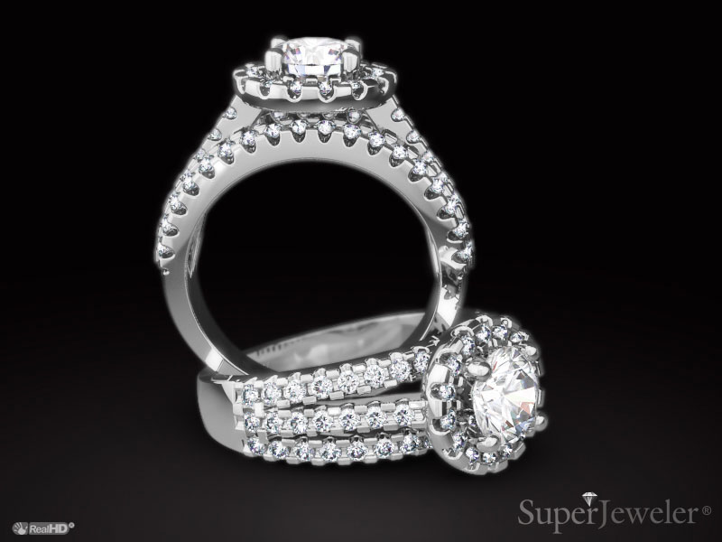For a classically beautiful diamond engagement ring, try this engagement ring crafted in 14 karat white gold. This ring boasts a 1 carat center surrounded by a halo of diamonds, and a three row shank adorned with accent diamonds. The ring has a total diamond weight of 2 carats. There are 71 diamonds total in H-I color and SI2-I1 clarity.