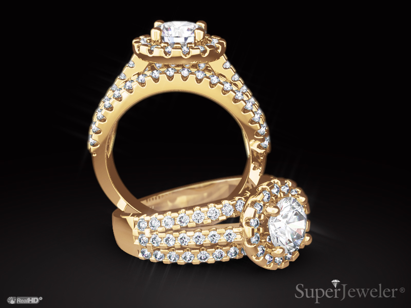 For a classically beautiful diamond engagement ring, try this engagement ring crafted in 14 karat yellow gold. This ring boasts a 1 carat center surrounded by a halo of diamonds, and a three row shank adorned with accent diamonds. The ring has a total diamond weight of 2 carats. There are 71 diamonds total in H-I color and SI2-I1 clarity.