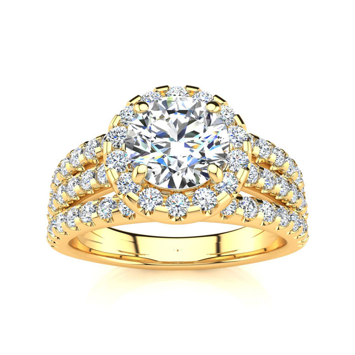 For a classically beautiful diamond engagement ring, try this engagement ring crafted in 14 karat yellow gold. This ring boasts a 1 carat center diamond that has been clarity enhanced and is surrounded by a halo of diamonds, and a three row shank adorned with accent diamonds. The ring has a total diamond weight of 2 carats. There are 71 diamonds total in I-J color and I2 clarity.