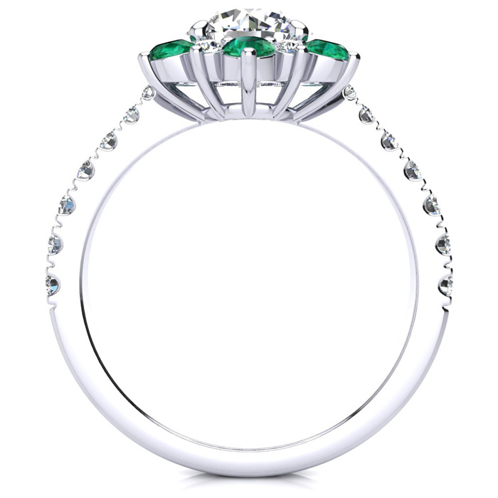 This ring features a 1 carat round shape center diamond in H-I color. There are 20 sparkling side diamonds in a halo and down the band in SI2-I1 clarity and 6 emerald gemstones at approximately 1 carat. Total gem weight is approximately 2 carats. This ring is in 14 karat white gold. Ring top measures 8x8mm.
