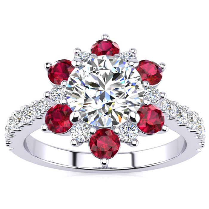 This ring features a 1 carat round shape center diamond in H-I color. There are 20 sparkling side diamonds in a halo and down the band in SI2-I1 clarity and 6 ruby gemstones at approximately 1 carat. Total gem weight is approximately 2 carats. This ring is in 14 karat white gold. Ring top measures 8x8mm.