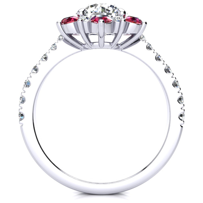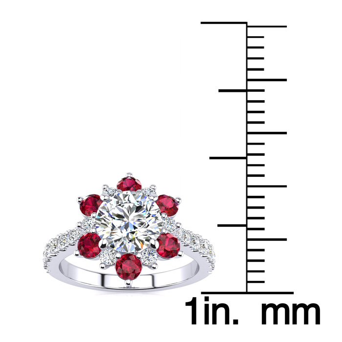 This ring features a clarity enhanced 1 carat round shape center diamond in I-J color. There are 20 sparkling side diamonds in a halo and down the band in I1-I2 clarity and 6 ruby gemstones at approximately 1 carat. Total gem weight is approximately 2 carats. This ring is in 14 karat white gold. Ring top measures 8x8mm.