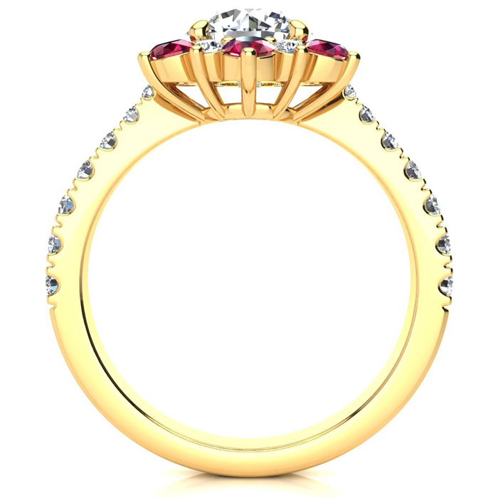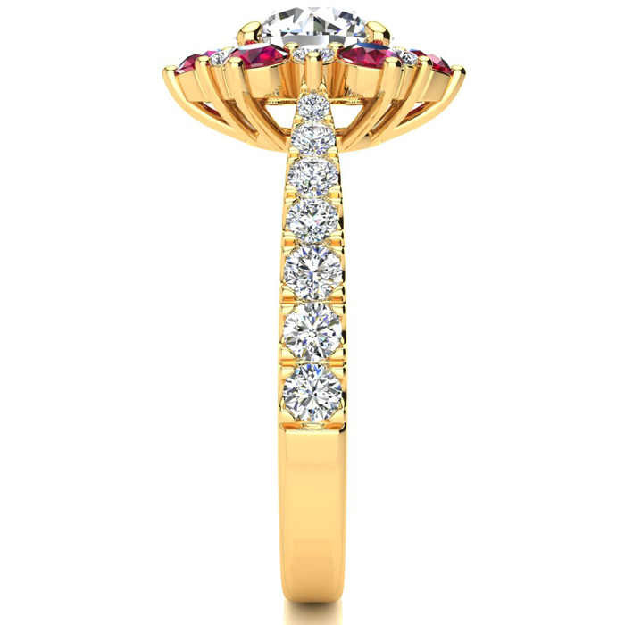 This ring features a 1 carat round shape center diamond in H-I color. There are 20 sparkling side diamonds in a halo and down the band in SI2-I1 clarity and 6 ruby gemstones at approximately 1 carat. Total gem weight is approximately 2 carats. This ring is in 14 karat yellow gold. Ring top measures 8x8mm.