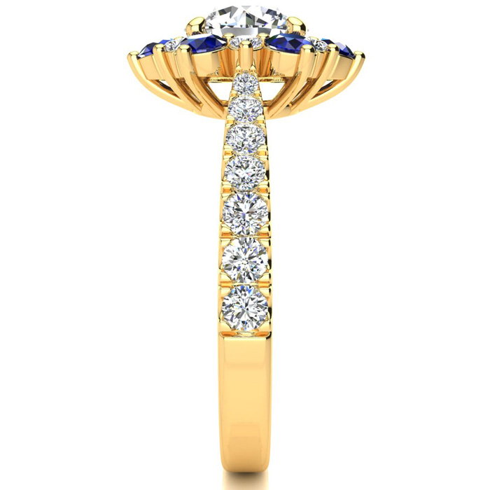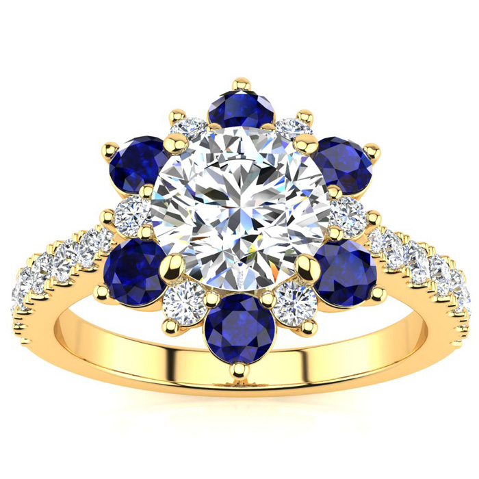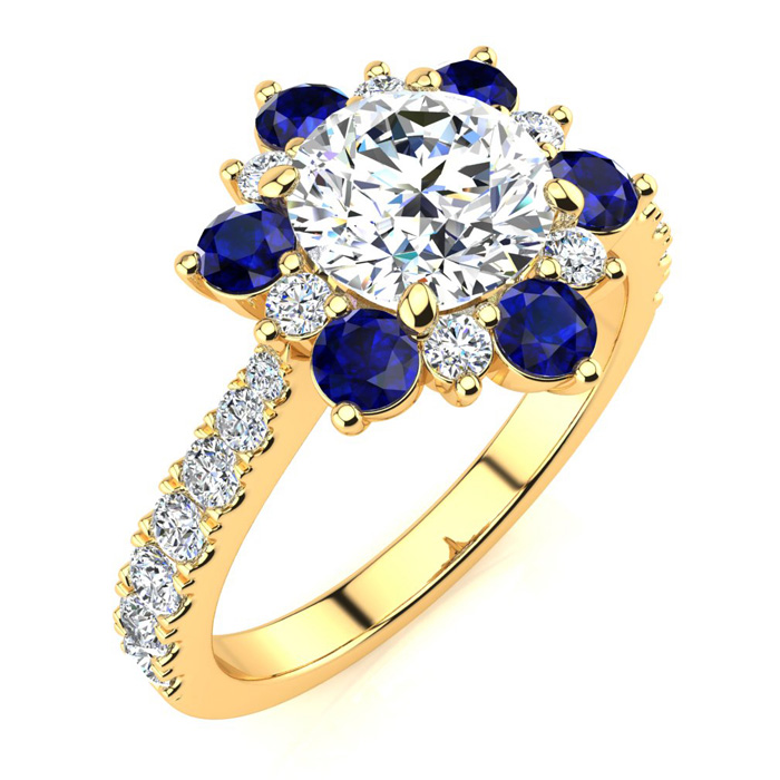 2 Carat Natural Round Shape Flower Halo Sapphire and Diamond Engagement Ring In 14K Yellow Gold