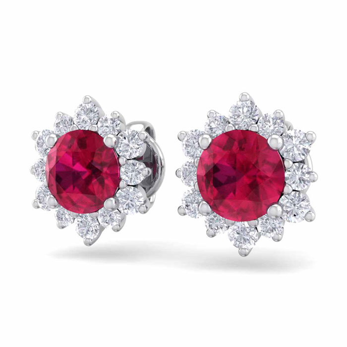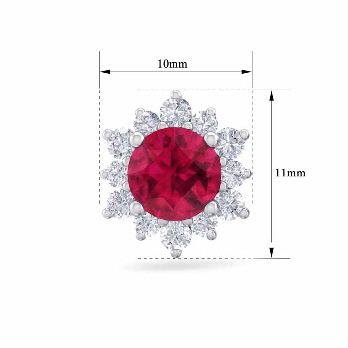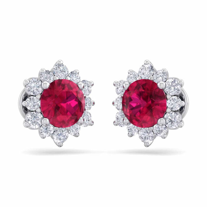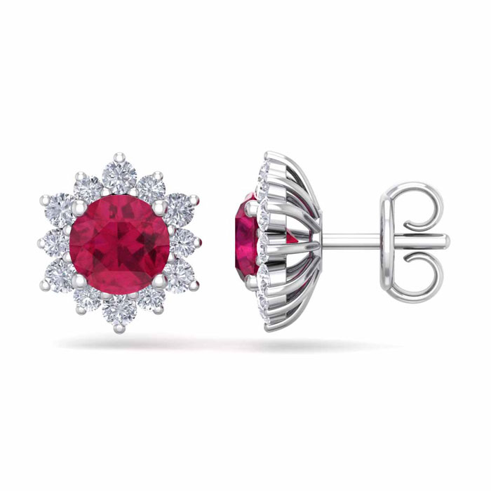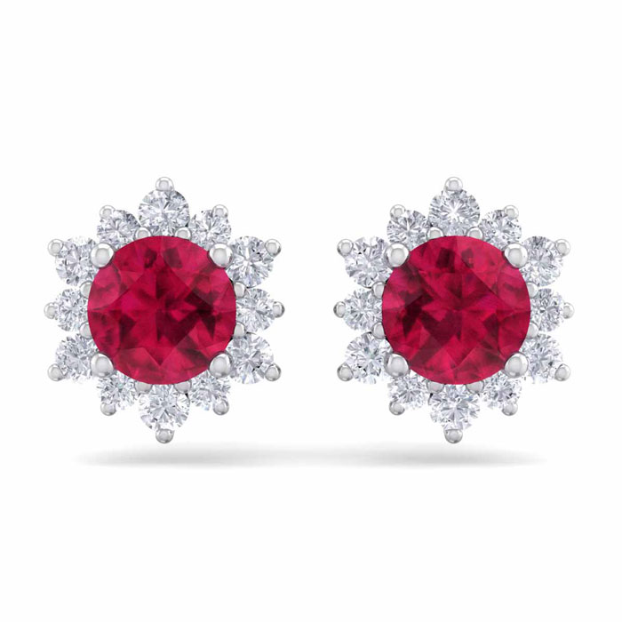 2 Carat Round Shape Flower Ruby and Diamond Halo Stud Earrings In 14 Karat White Gold