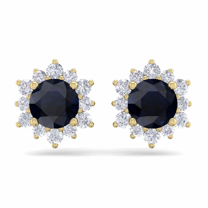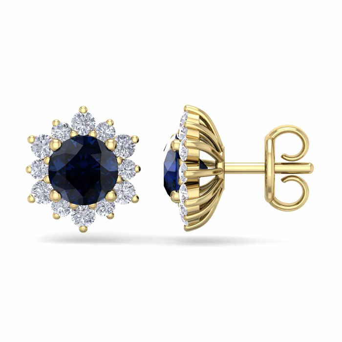 2 Carat Round Shape Flower Sapphire and Diamond Halo Stud Earrings In 14 Karat Yellow Gold