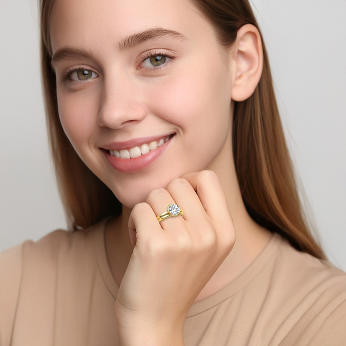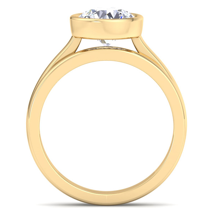 This lab grown diamond ring features a 2 carat Round shape center lab grown diamond in G-H color, VS clarity in a sideways bezel setting. This ring is in 14 karat yellow gold. This ring includes a matching gold band.