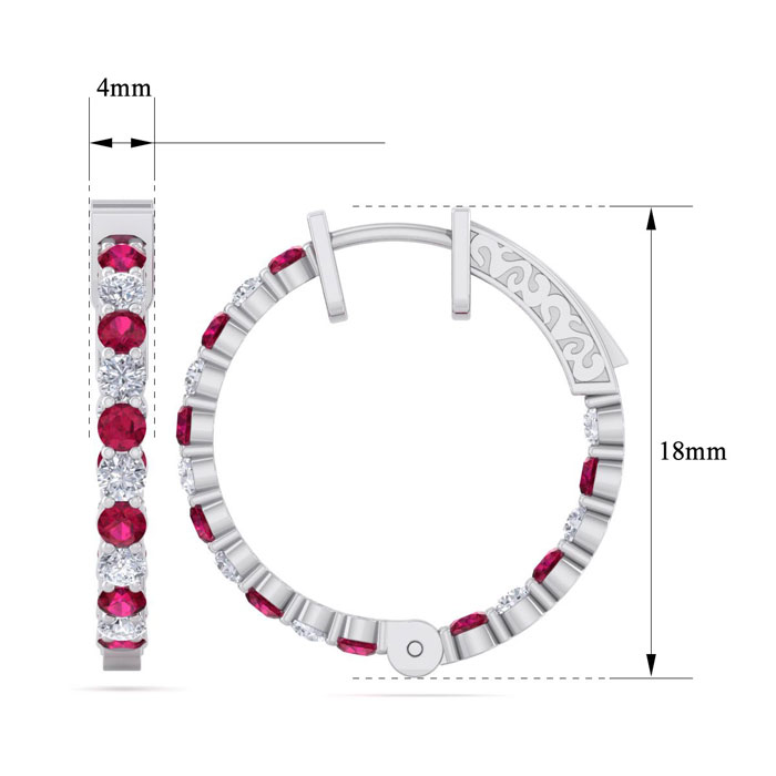 2 Carat Ruby and Diamond Hoop Earrings In 14 Karat White Gold, 3/4 Inch