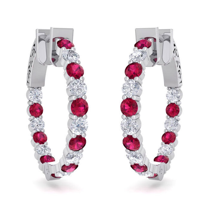 These classic hoop earrings feature 17 sparkling diamonds in J-K color, I2-I3 clarity and 17 ruby gemstones. Total carat weight is 2 carats. These earrings are in 14 karat white gold and have secure hidden snap backs. These earrings are 3/4 inch in diameter.