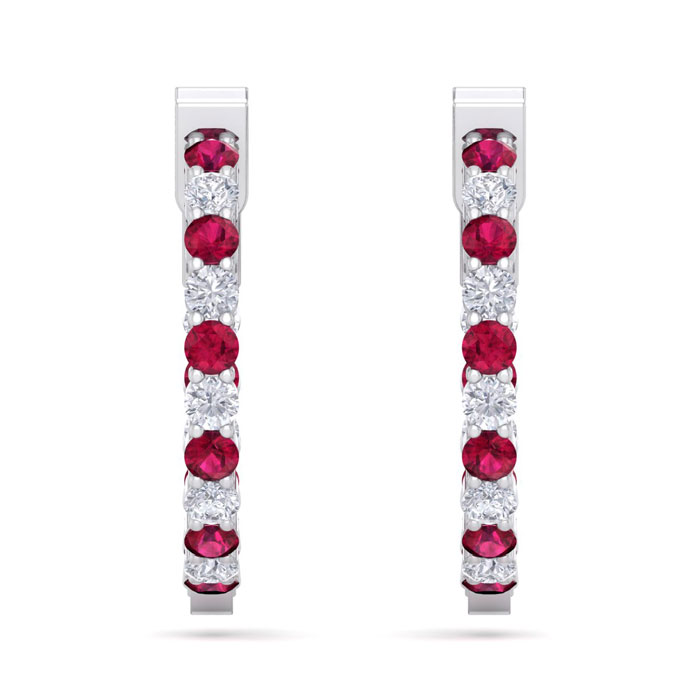 2 Carat Ruby and Diamond Hoop Earrings In 14 Karat White Gold, 3/4 Inch