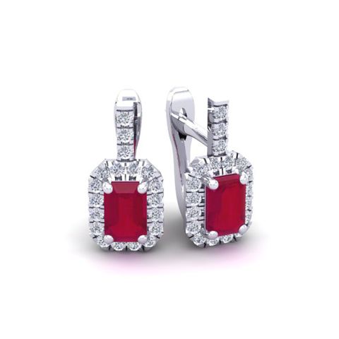 These stunning gemstone and halo diamond earrings feature two 6x4mm emerald cut created ruby gemstones at 1.50 carats. The gemstones are surrounded by 38 sparkling diamonds in a halo in I-J color, SI2-I1 clarity at 0.48 carats. Total gem weight is 1.98 carats. These earrings are crafted in 14 karat white gold and come with comfortable and secure snap backs.
