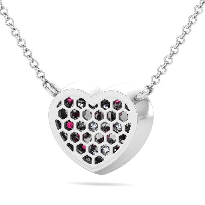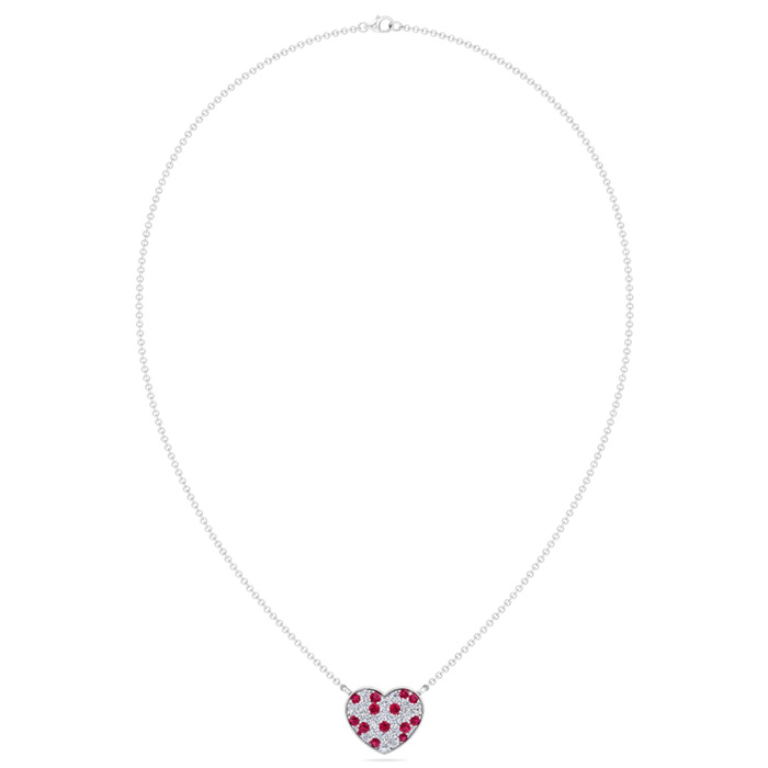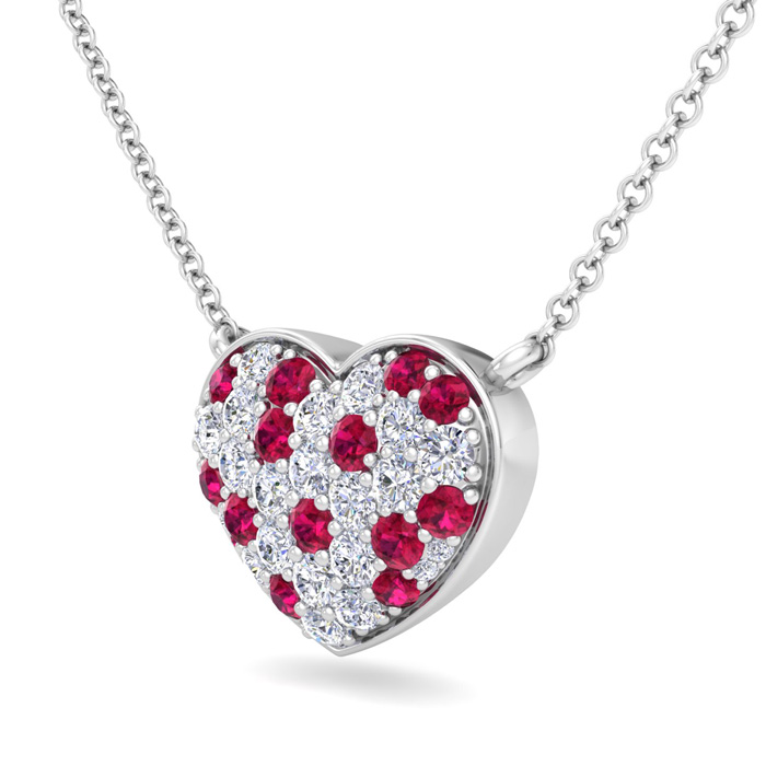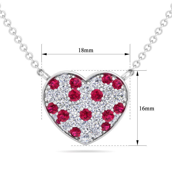 This diamond heart necklace features 18 sparkling round shape lab grown diamonds and 17 ruby gemstones totaling 2 carats. Diamond color is G-H, diamond clarity VS. This necklace is in 14 karat white gold and comes with an adjustable cable chain with a lobster-claw clasp. The chain has rings at 16, 17 and 18 inches. This pendant is 3/4 inch in diameter.