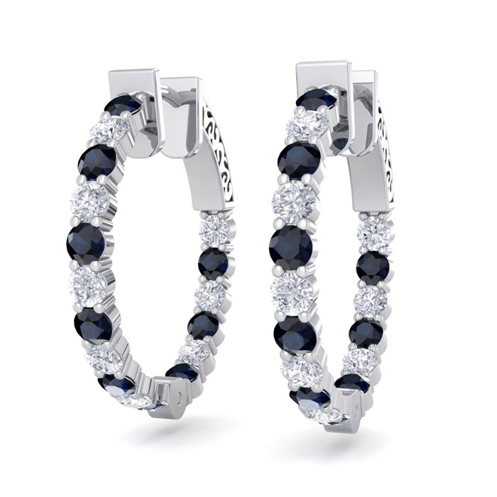 These classic hoop earrings feature 17 sparkling diamonds in I-J color, I1-I2 clarity and 17 sapphire gemstones. Total carat weight is 2 carats. These earrings are in 14 karat white gold and have secure hidden snap backs. These earrings are 3/4 inch in diameter.