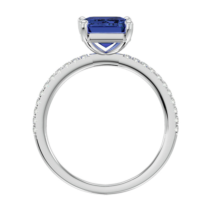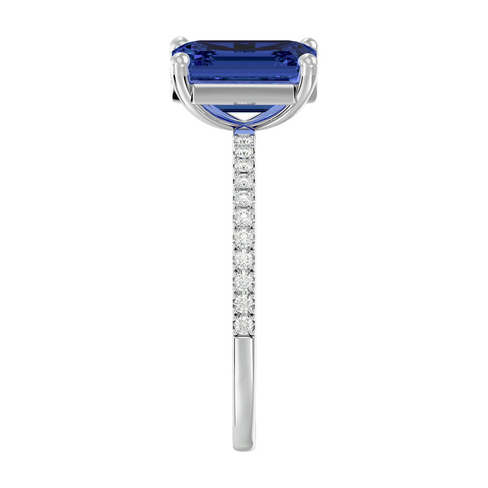 This stunning gemstone and diamond ring features one 8x6mm emerald shape tanzanite gemstone at 1.75 carats. It is surrounded by 22 sparkling diamonds along the band in I-J color, I1-I2 clarity at 0.18 carats. Total gem weight is 1.93 carats. This ring is crafted in 14 karat white gold.