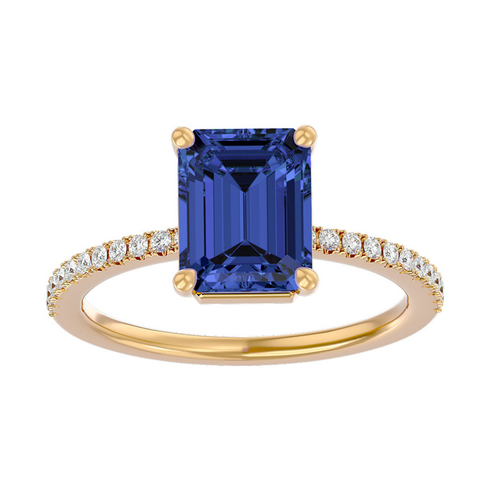 This stunning gemstone and diamond ring features one 8x6mm emerald shape tanzanite gemstone at 1.75 carats. It is surrounded by 22 sparkling diamonds along the band in I-J color, I1-I2 clarity at 0.18 carats. Total gem weight is 1.93 carats. This ring is crafted in 14 karat yellow gold.