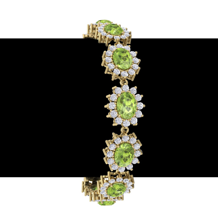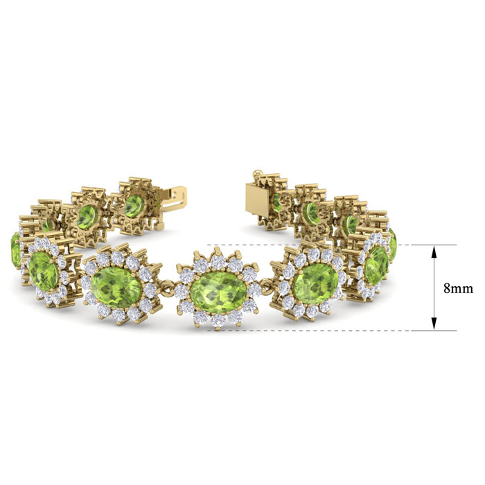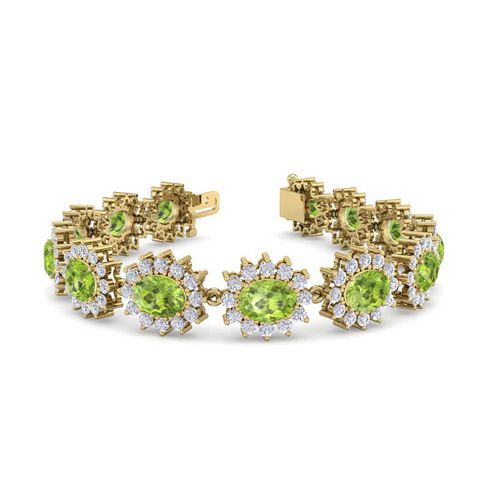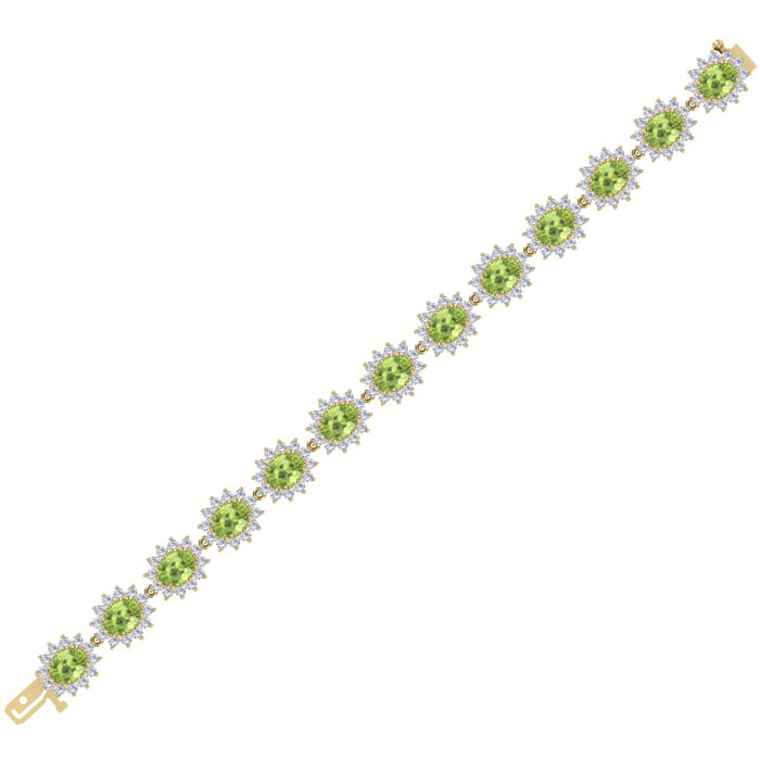 22 Carat Oval Shape Peridot and Halo Diamond Bracelet In 14 Karat Yellow Gold, 7 Inches