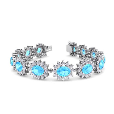 24 Carat Oval Shape Blue Topaz and Halo Diamond Bracelet In 14 Karat White Gold, 7 Inches