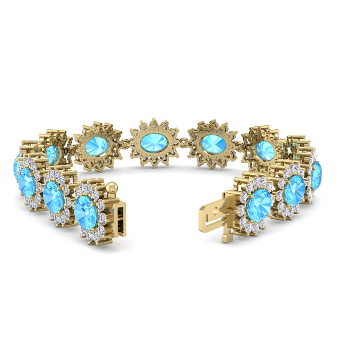 Retrograde Birthstones™ 24 Carat Oval Shape Blue Topaz and Halo Diamond Bracelet In 14 Karat Yellow Gold, 7 Inches