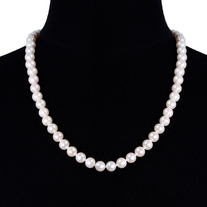 This classic hand-knotted 10mm pearl necklace is 24 inches long, with a 14 karat yellow gold fancy clasp. Necklace features AA+ quality cultured pearls.