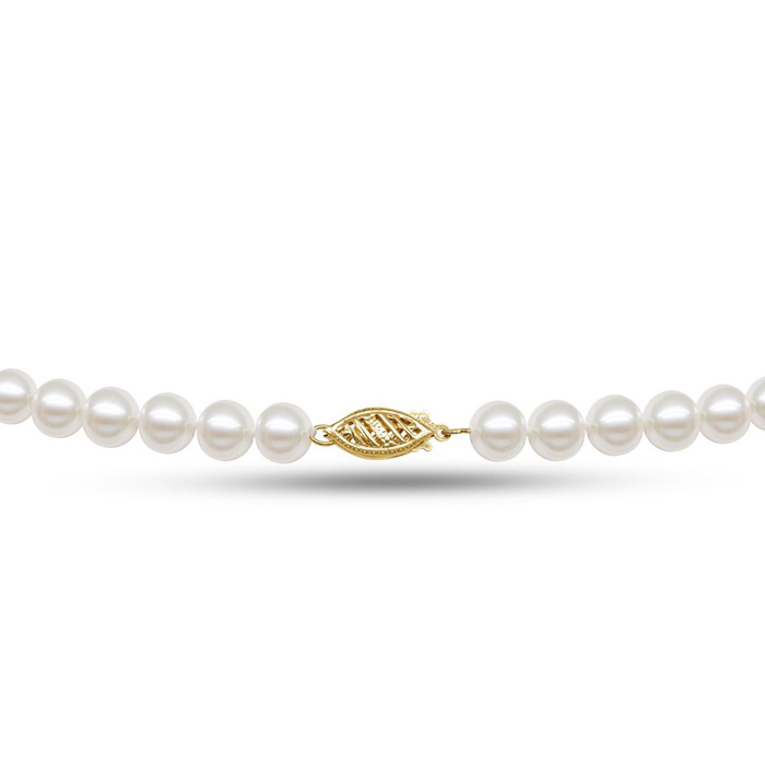 This classic hand-knotted 7mm pearl necklace is 24 inches long, with a 14 karat yellow gold fancy clasp. Necklace features AA quality cultured pearls.